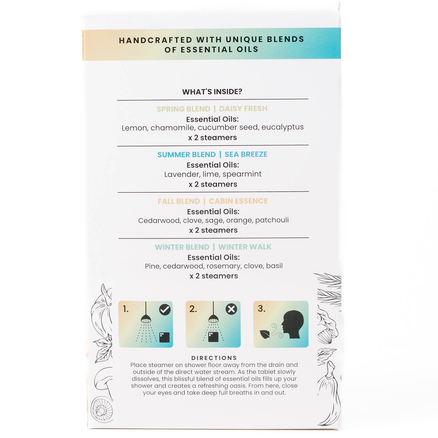 Experience all four seasons — and four moods — in one unforgettable gift. The Season’s Collection is a unique aromatherapy shower steamer gift box featuring four handcrafted essential oil blends inspired by Spring, Summer, Fall, and Winter. Each scent captures a distinct feeling: Spring’s renewal, Summer’s easygoing warmth, Fall’s cozy richness, and Winter’s calm inspiration.